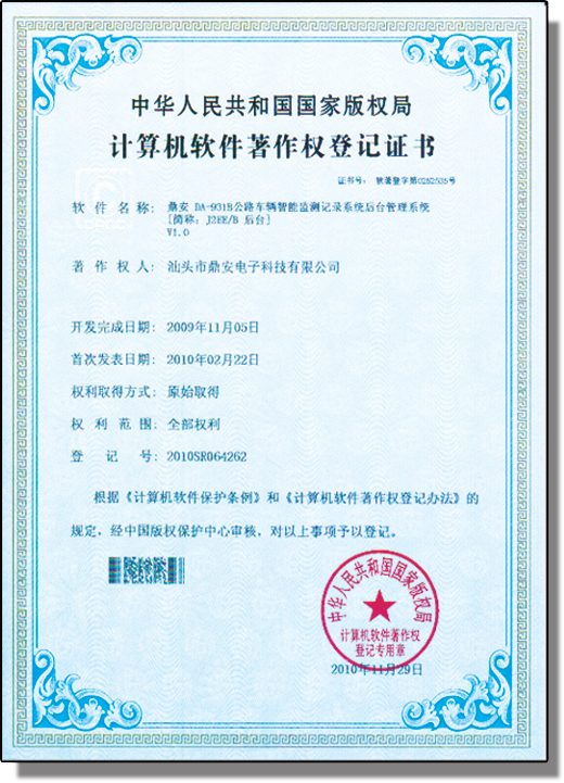 DA-931后平臺數(shù)據(jù)管理系統(tǒng)嚴(yán)格按照GA/T 497-2009《公路車輛智能監(jiān)測記錄系統(tǒng)通用技術(shù)條件》、《廣東省治安卡口視頻監(jiān)控系統(tǒng)建設(shè)規(guī)范》、GA/T 496–2009《闖紅燈自動記錄系統(tǒng)通用技術(shù)條件》等相關(guān)公共安全行業(yè)標(biāo)準(zhǔn),對整個系統(tǒng)建設(shè)進(jìn)行了詳細(xì)規(guī)劃設(shè)計,充分體現(xiàn)出安全、實用、合理、易維護(hù)等特點(diǎn)。該系統(tǒng)已得到國家版權(quán)局計算機(jī)軟件著作登記權(quán)證書(軟著登字第0252535號)。